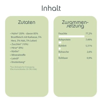 Das ChronoBalance Nassfutter mit Bio-Huhn ist ein Premium-Futter mit hohem Fleischanteil. Die fein abgestimmte, glutenfreie Rezeptur ist speziell für Feinschmeckerhunde entwickelt worden. Gleichzeitig versorgt unser Hundefutter Ihren Hund mit allen wichtigen Nährstoffen und Vitaminen. Hühnerfleisch hat eine besonders hohe biologische Wertigkeit. Das bedeutet, dass die enthaltenen Proteine besonders gut verwertet werden können. Aber es ist nicht nur ein besonders guter Eiweißlieferant, sondern auch reich an Magnesium, Eisen und Vitaminen. Die schonende Herstellung sorgt dafür, dass die Vitalstoffe im Nassfutter bestmöglich erhalten bleiben.