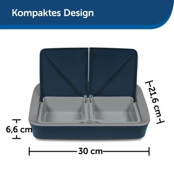 Dank des kompakten Designs können Sie den eleganten Futterautomaten überall in Ihrem Zuhause aufstellen. Die Schalen zum Reinigen einfach in den oberen Korb des Geschirrspülers legen.